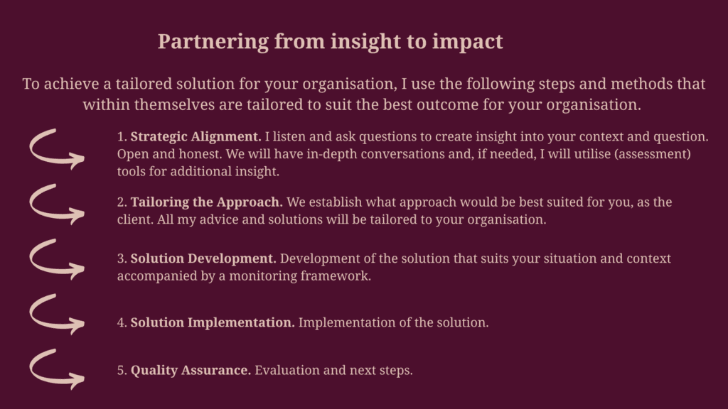 I design strategies that unlock potential. Through meaningful conversation, you and I achieve insight into the situation of your organisation and your accompanying request. This allows me to analyse the context, hurdles and opportunities, and visualise the missing pieces. Subsequently, I can tailor my advice and support.