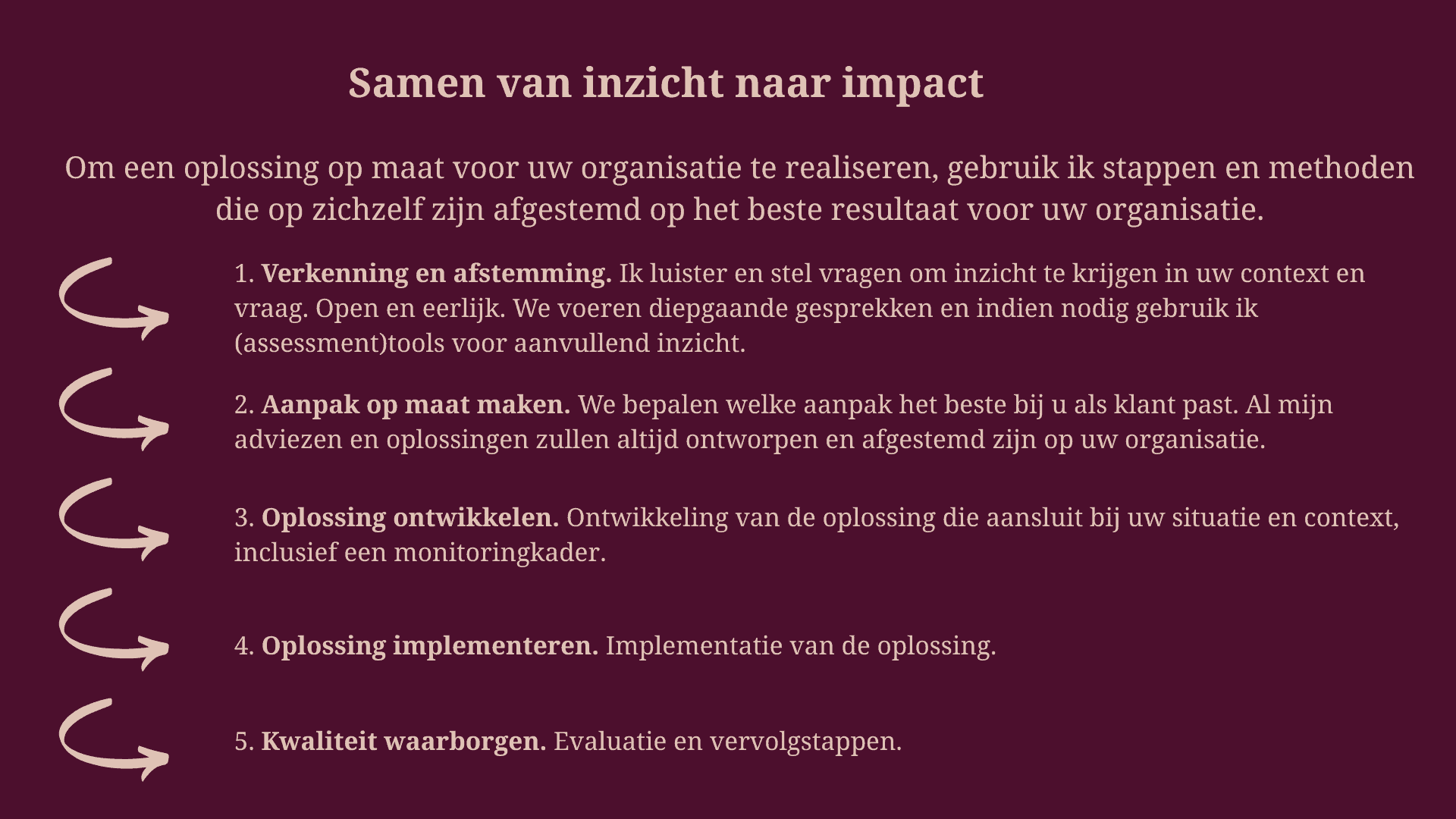 Het doel van mijn betrokkenheid bij een organisatie is altijd om volledig begrip en beheersing van de gebruikte informatie en tools achter te laten, zodat duurzame impact mogelijk is.